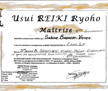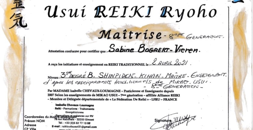 Vendredi dernier j’ai pu terminer mon dernier degré du Reiki. Je suis désormais « Maitre Reiki » grâce à une formatrice exceptionnelle. Elle m’a appris tellement de choses, avec gentillesse, bienfaisance et passion. Je la remercie du fond du coeur!!! 💖💖💖